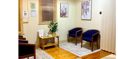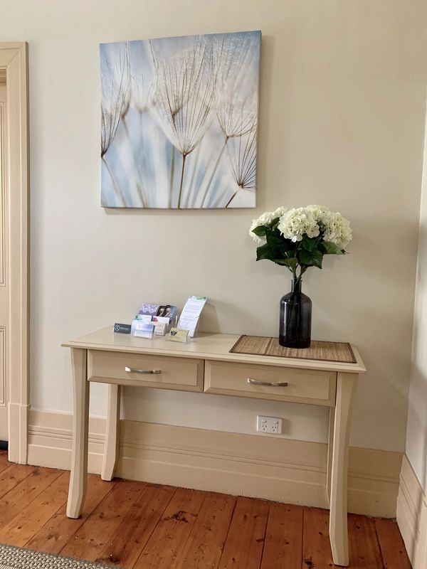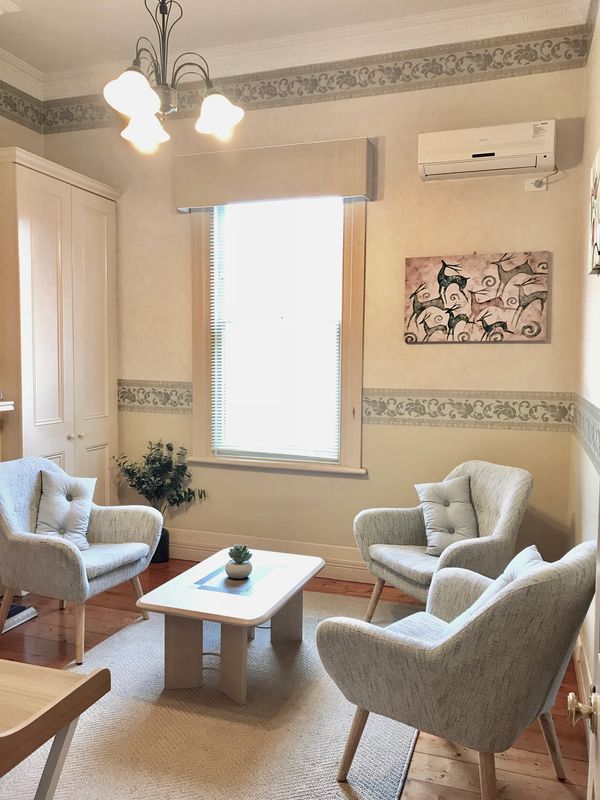 Suitable for Psychologist, Counsellor or other Allied Health Service. Spacious room with ornamental fireplace, timber floor, floor rug, comfortable seating and coffee table. The small stained glass window and a beautiful mantle over the fireplace add to the quality and appeal of this room. Reverse cycle heating and cooling.