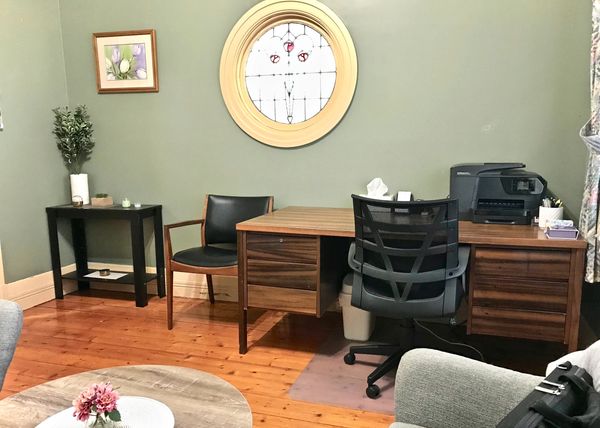 Suitable for Psychologist, Counsellor or other Allied Health Service. Lovely room with a large window, timber floors, carpet rug and a beautiful round stained glass window that adds to its charm. Reverse cycle heating and cooling. Medium size desk, with counselling setting alongside. Some storage space available. Small printer/copier in room.